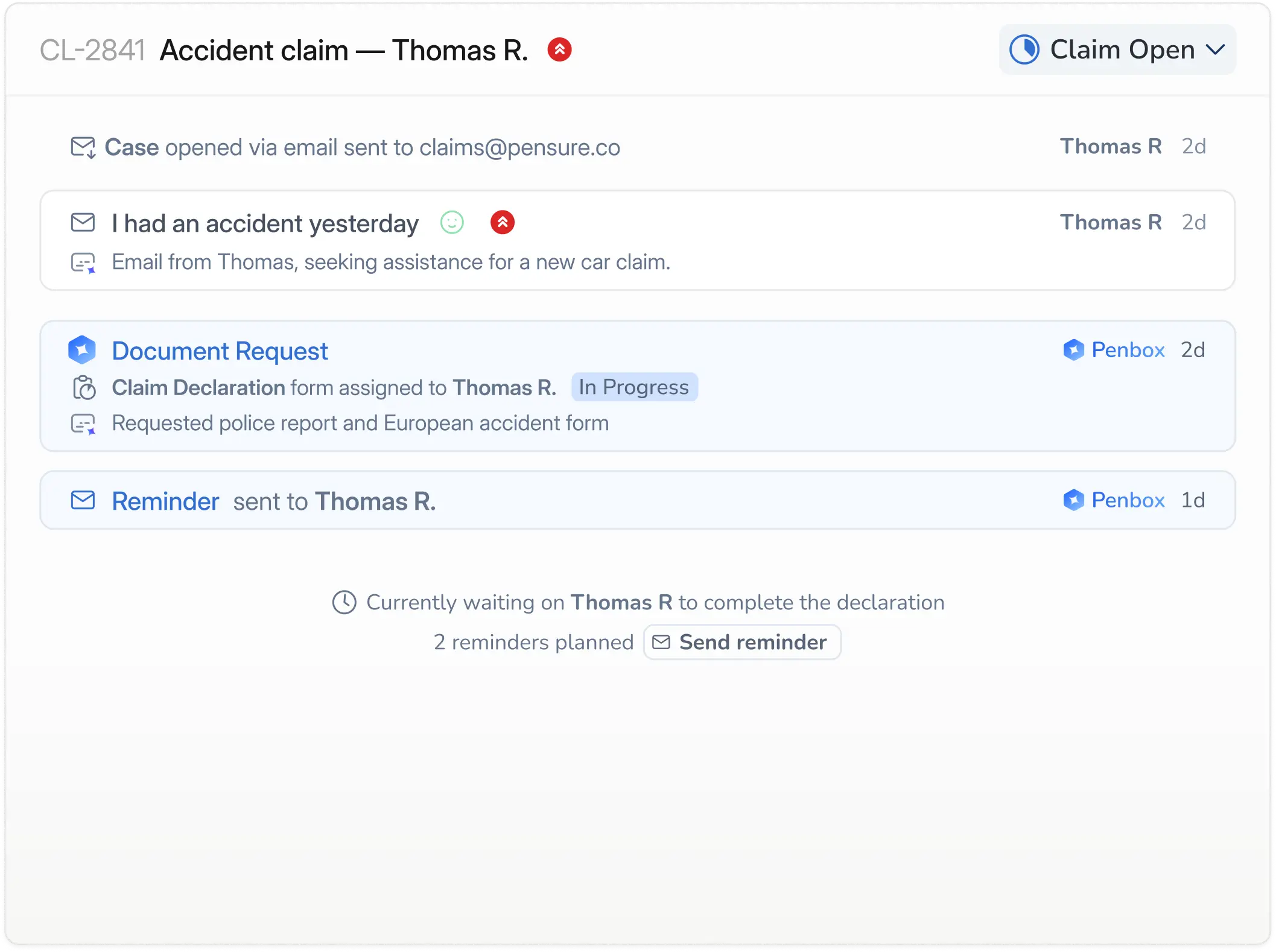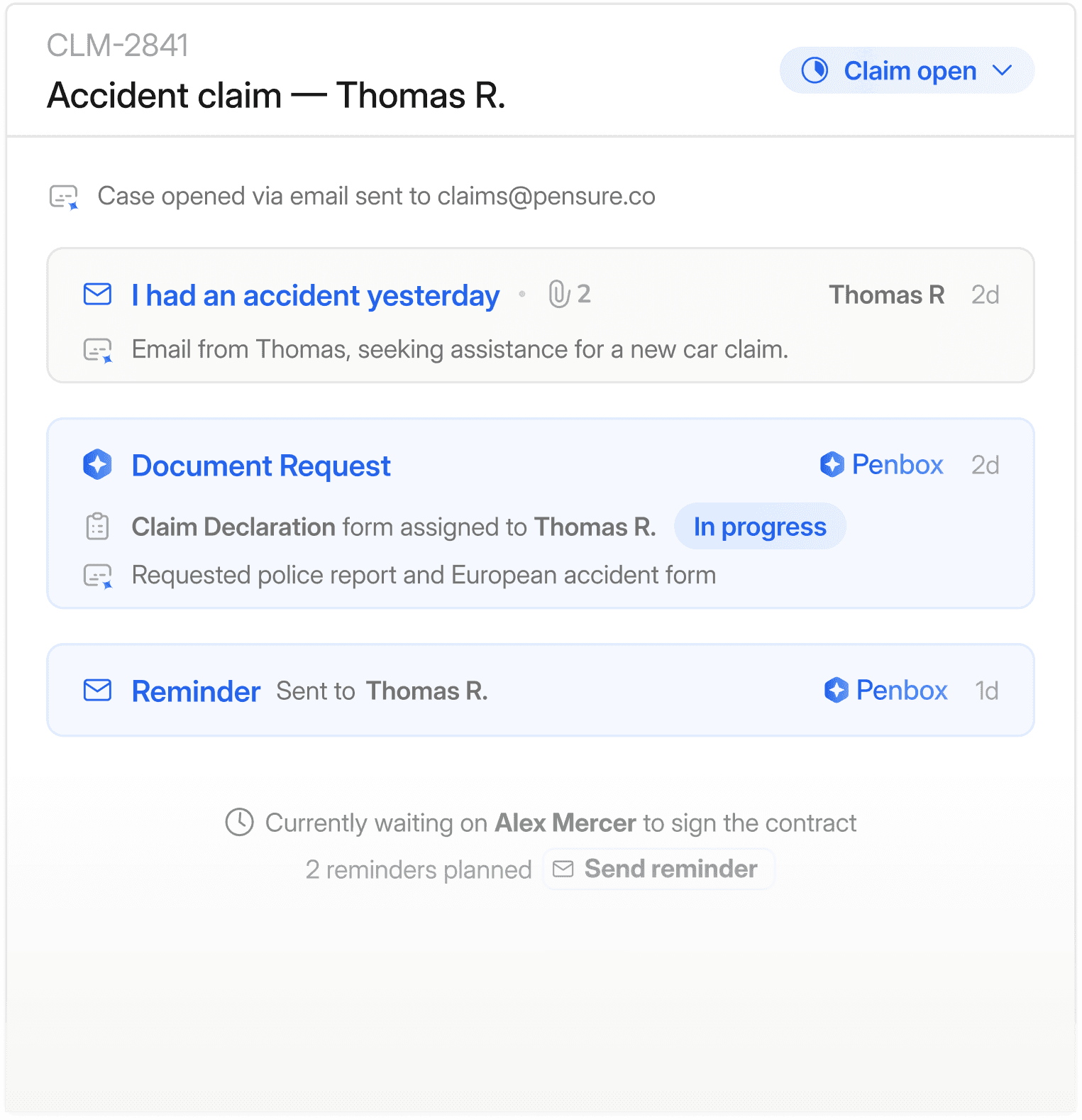 Penbox turns emails and documents into structured case workflows for customer operations teams. Clear ownership and built-in exception handling. All on top of your existing systems.